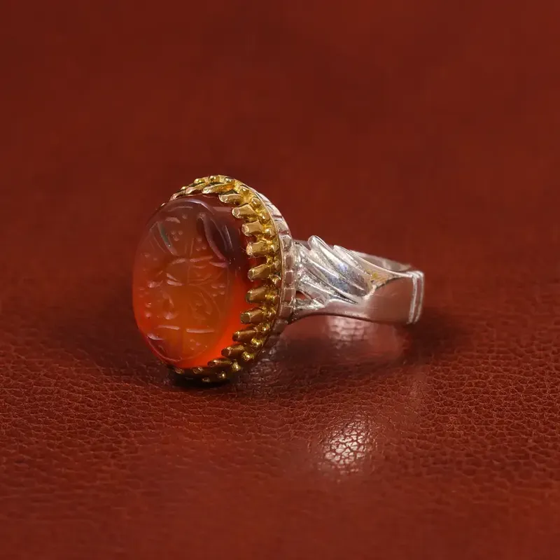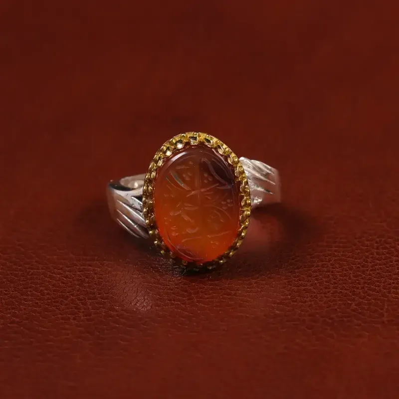 انگشتر عقیق یمن مردانه. نگین عقیق گوهری ارزشمند که بر روی این رکاب قرار گرفته و زیبایی این اثر را چندین برابر میکند. جنس رکاب این انگشتر نقره با عیار 925 می باشد که به خاطر خواص و قیمت مناسب در جواهرسازی و ساخت انگشتر بسیار استفاده می شود.
