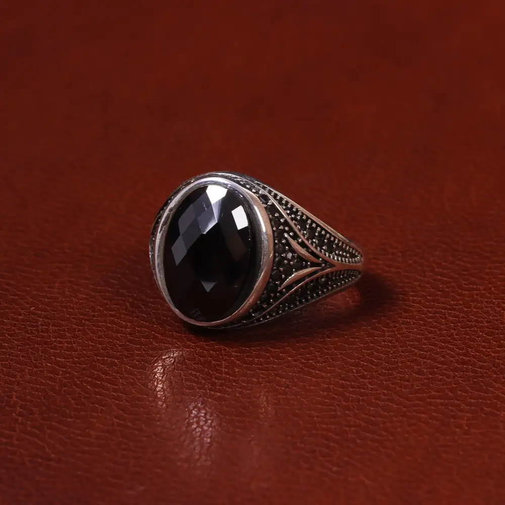 انگشتر عقیق مشکی مردانه. نگین عقیق مشکی گوهری ارزشمند که بر روی این رکاب قرار گرفته و زیبایی این اثر را چندین برابر میکند.  جنس رکاب این انگشتر نقره با عیار 925 با روکش رادیوم می باشد که به خاطر خواص و قیمت مناسب در جواهرسازی و ساخت انگشتر بسیار استفاده می شود.