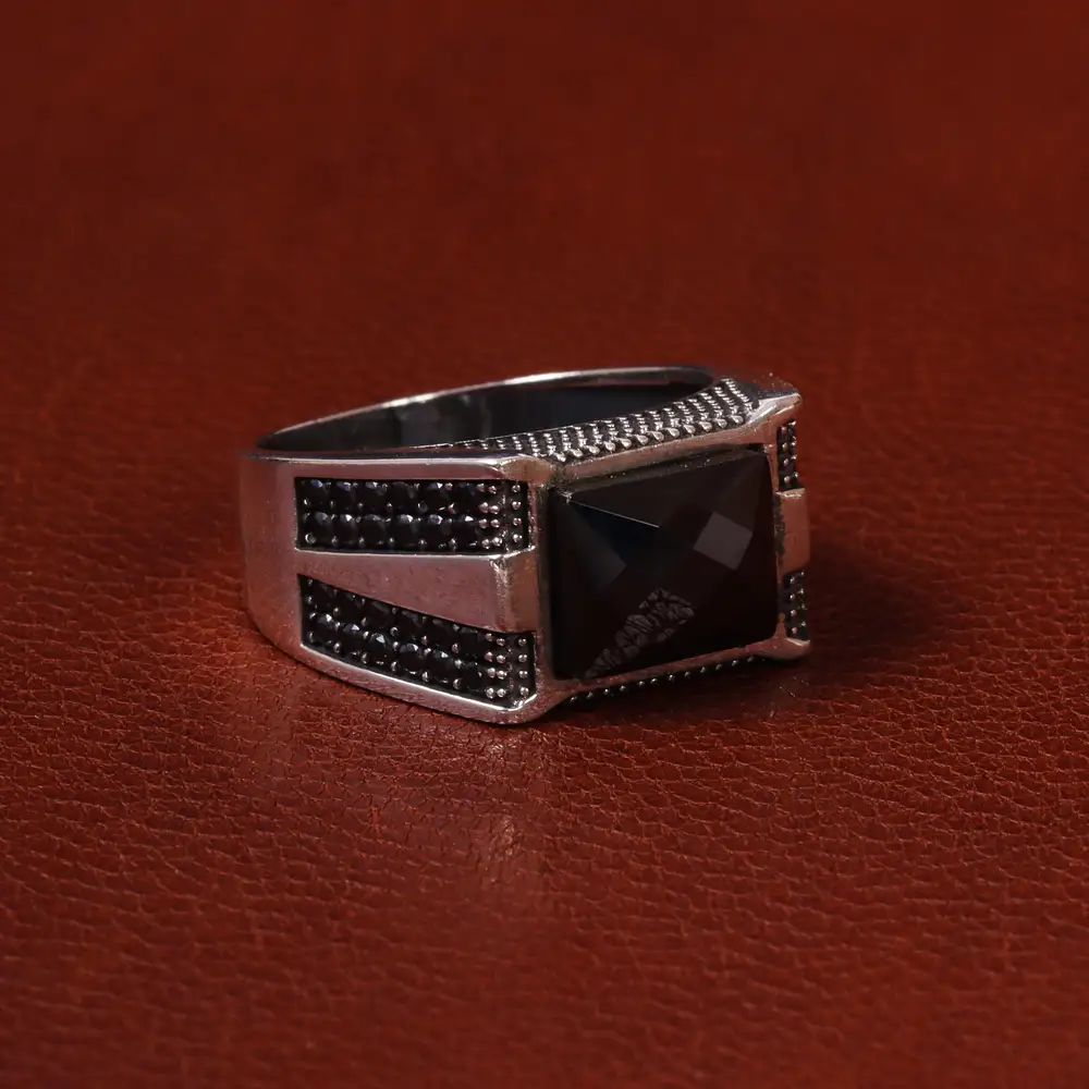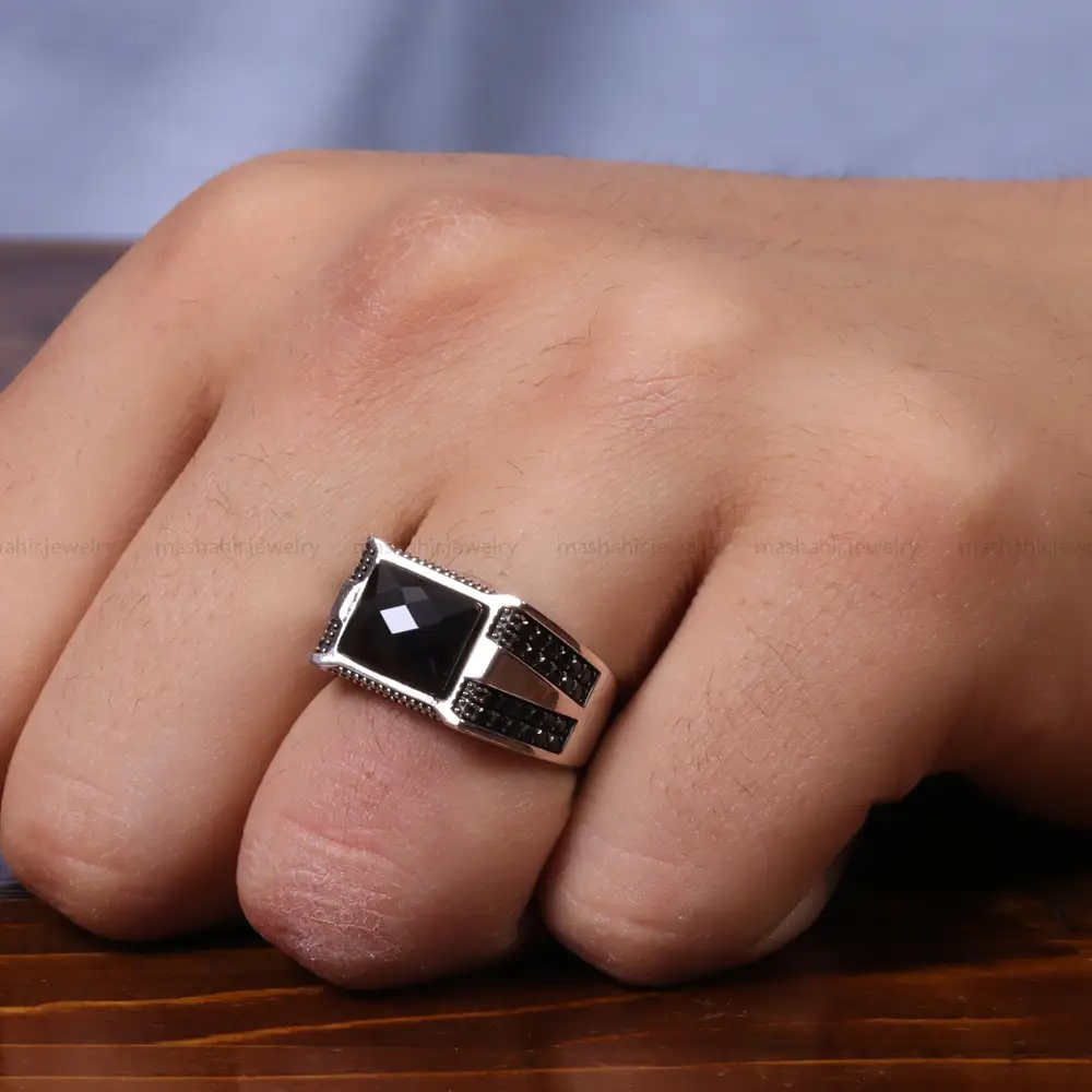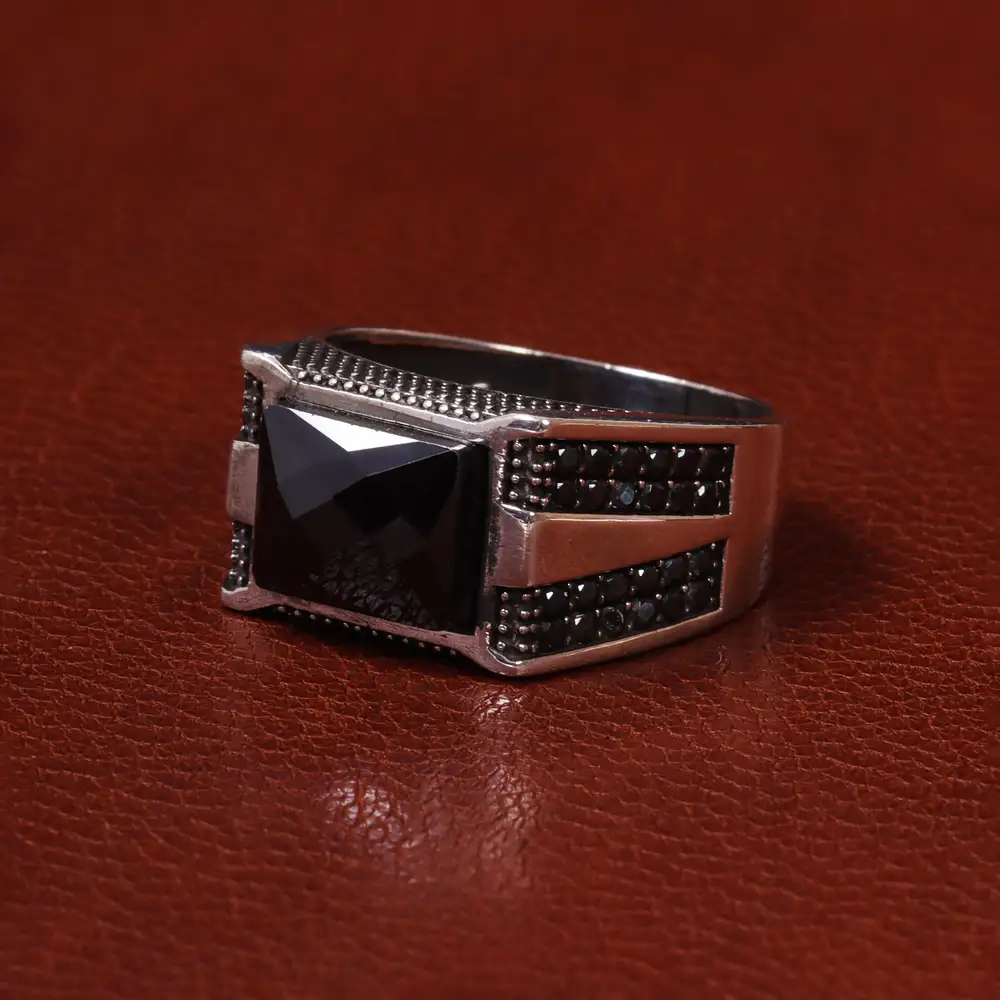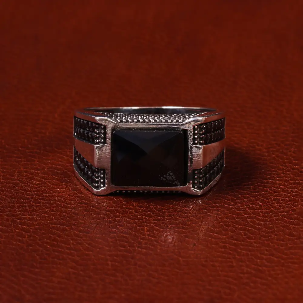 انگشتر عقیق مشکی مردانه. نگین عقیق مشکی گوهری ارزشمند که بر روی این رکاب قرار گرفته و زیبایی این اثر را چندین برابر میکند. جنس رکاب این انگشتر نقره با عیار 925 می باشد که به خاطر خواص و قیمت مناسب در جواهرسازی و ساخت انگشتر بسیار استفاده می شود.