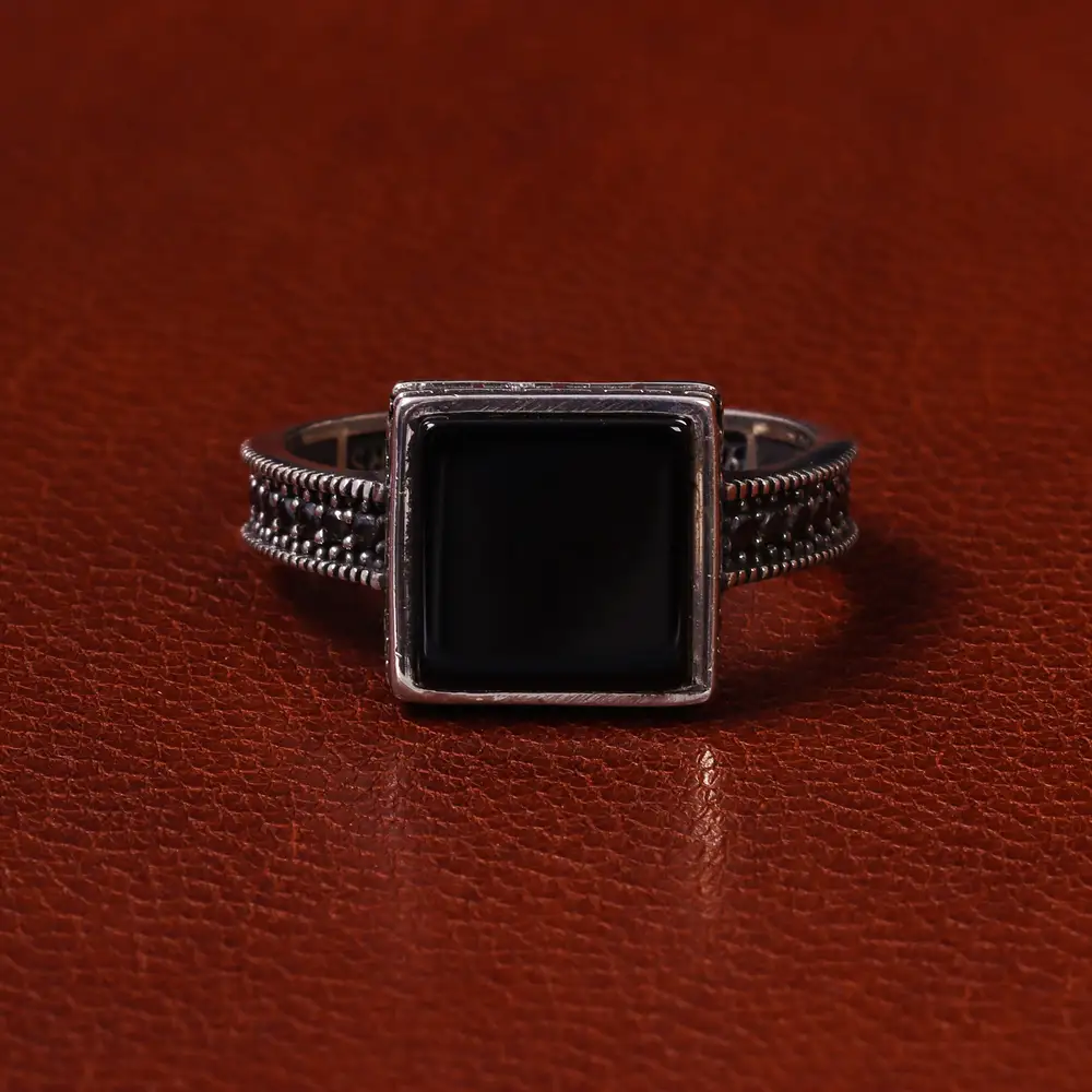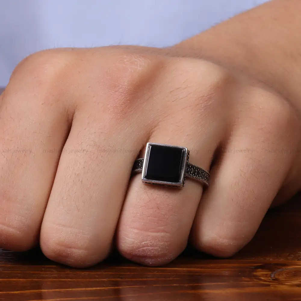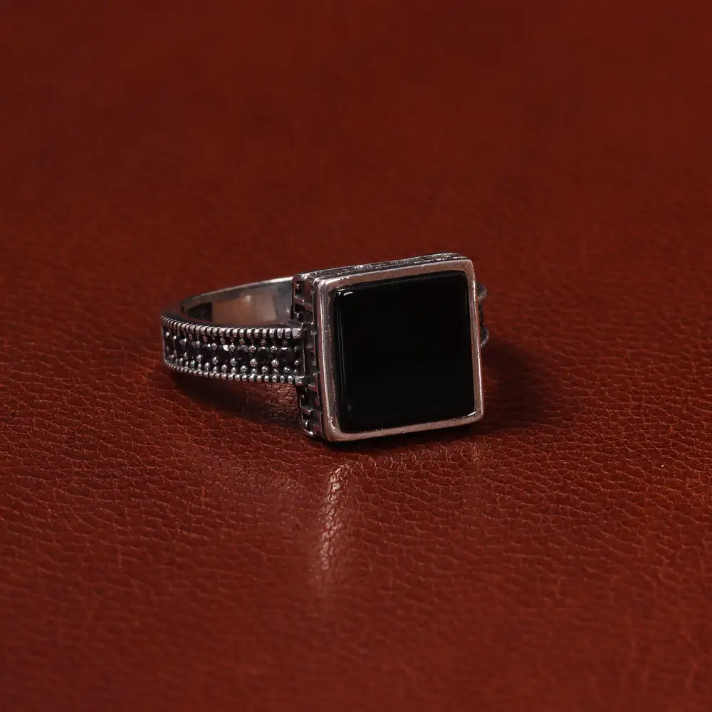 انگشتر عقیق مشکی مردانه. نگین عقیق مشکی گوهری ارزشمند که بر روی این رکاب قرار گرفته و زیبایی این اثر را چندین برابر میکند.  جنس رکاب این انگشتر نقره با عیار 925 با روکش رادیوم می باشد که به خاطر خواص و قیمت مناسب در جواهرسازی و ساخت انگشتر بسیار استفاده می شود.
