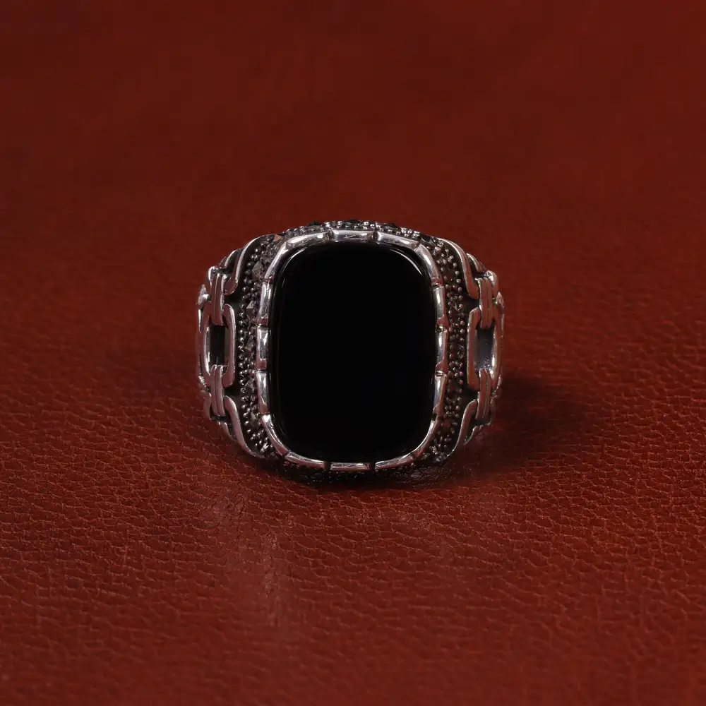 انگشتر عقیق مشکی مردانه. نگین عقیق مشکی گوهری ارزشمند که بر روی این رکاب قرار گرفته و زیبایی این اثر را چندین برابر میکند. جنس رکاب این انگشتر نقره با عیار 925 می باشد که به خاطر خواص و قیمت مناسب در جواهرسازی و ساخت انگشتر بسیار استفاده می شود.