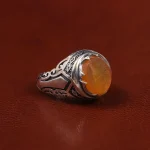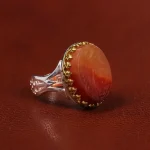 انگشتر عقیق مردانه کد 31093 دارای رکاب دست‌ساز از نقره 925 با روکش رادیوم است که در برابر تیرگی و تغییر رنگ مقاوم بوده و درخشش خود را برای مدت طولانی حفظ می‌کند. ساختار رکاب با ظرافت بالا و دقت در جزئیات طراحی شده است؛ پایه‌ها به‌صورت ظریف و متقارن از دو طرف به سمت نگین امتداد یافته‌اند تا تمرکز بصری کاملاً بر روی نگین عقیق باقی بماند. پرداخت دقیق سطح رکاب و لبه‌های نرم، کیفیت ساخت بالا و مهارت سازنده را به‌خوبی نشان می‌دهد.