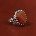 انگشتر عقیق مردانه کد 31093 با وزن 8.07 گرم و ابعاد نگین 15×12 میلی‌متر در دسته انگشترهای نسبتاً سنگین قرار دارد. نگین بیضی عقیق یمن با رنگ قرمز تیره در مرکز رکاب جای گرفته و با سطحی صیقلی و یکنواخت، جلوه‌ای گرم و چشمگیر ایجاد کرده است. ترکیب رنگ عقیق با درخشش نقره، تضادی هماهنگ و کلاسیک پدید آورده که حس اصالت و ظرافت را در طراحی این اثر برجسته می‌کند.