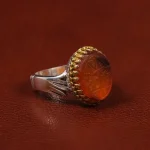 انگشتر عقیق یمن با رکاب دست ساز صفوی. نگین عقیق یمنی گوهری ارزشمند که بر روی رکاب قرار گرفته و زیبایی این اثر را چندین برابر میکند. جنس رکاب این انگشتر نقره با عیار 925 می باشد که به خاطر خواص و قیمت مناسب در جواهرسازی و ساخت انگشتر بسیار استفاده می شود.