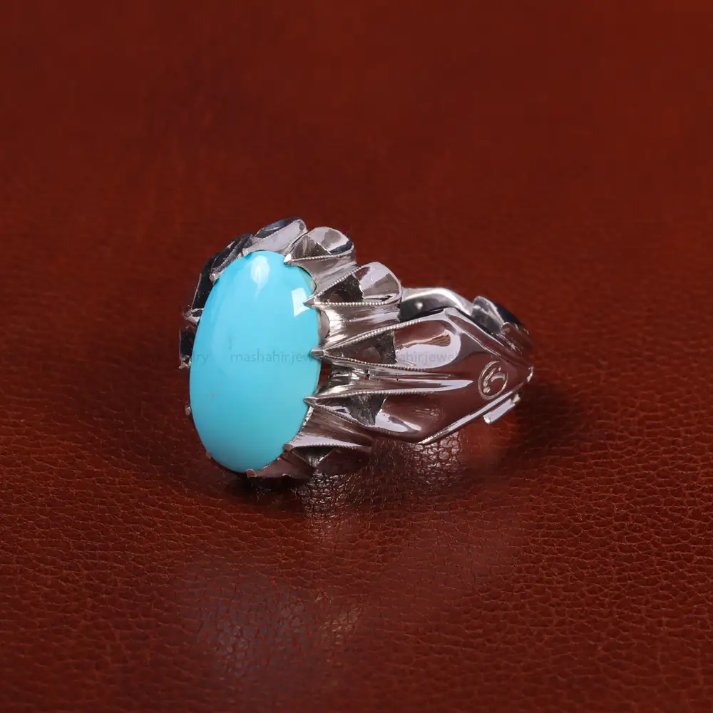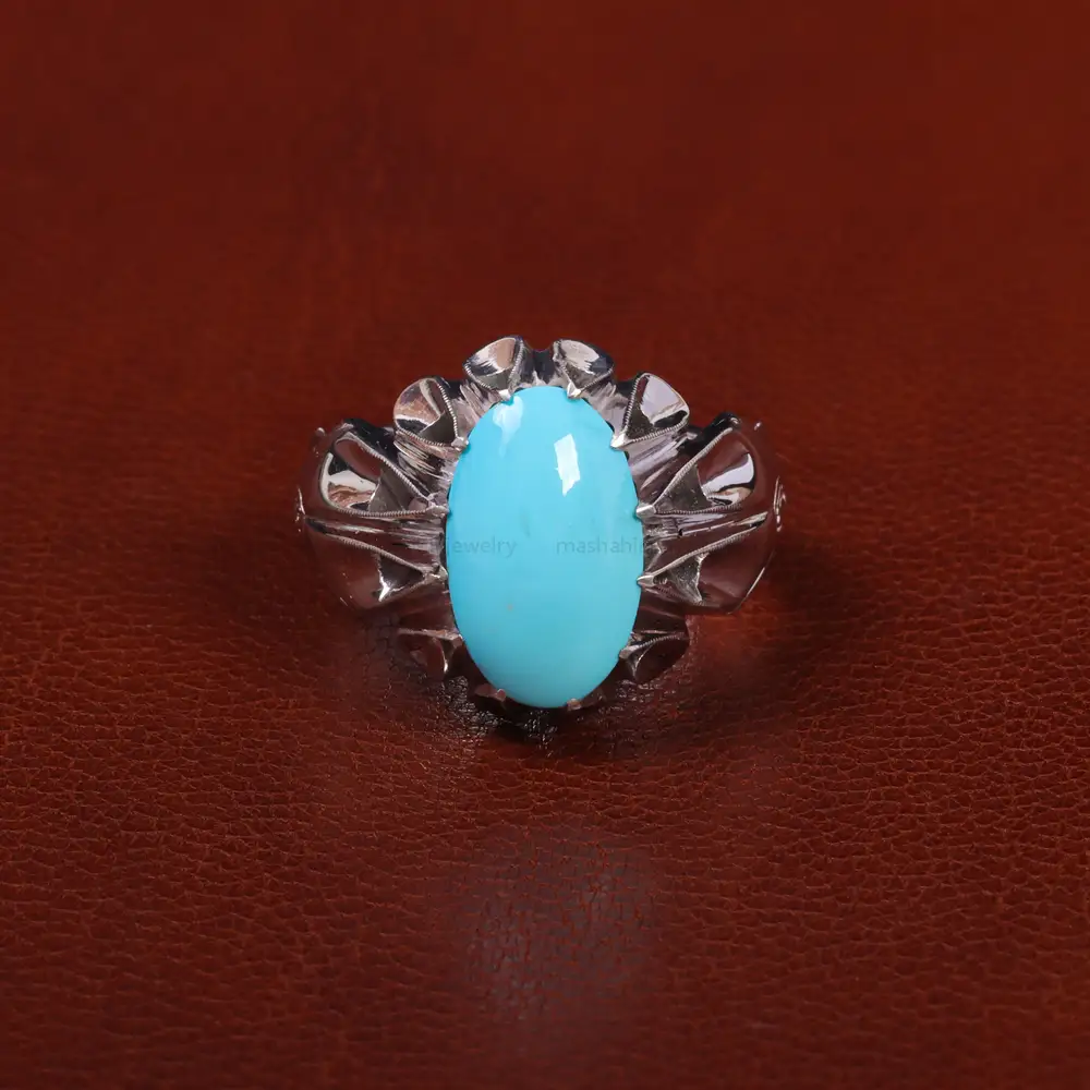 سنگ فیروزه عجمی. گوهری ارزشمند که بر روی رکاب این انگشتر قرار گرفته و زیبایی این اثر را چندین برابر میکند. جنس رکاب این انگشتر نقره با عیار 925 ساخته شده است که به خاطر خواص و قیمت مناسب در جواهرسازی و ساخت انگشتر بسیار استفاده می شود.
