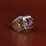 انگشتر آمیتیست مردانه با رکاب دست ساز و مخراجکاری الماس طبیعی (تراش برلیان). نگین آمیتیست برزیل گوهری ارزشمند که قرار گرفتن آن بر روی رکاب این انگشتر اثری خاص و فوق العاده زیبا را خلق کرده است. جنس رکاب این انگشتر نقره 925 با روکش رادیوم، مقاومت بالا در برابر تیرگی و خراش را فراهم می کند. انتخابی فاخر و متمایز برای آقایان خوش سلیقه و علاقه مند به زیورآلات خاص.