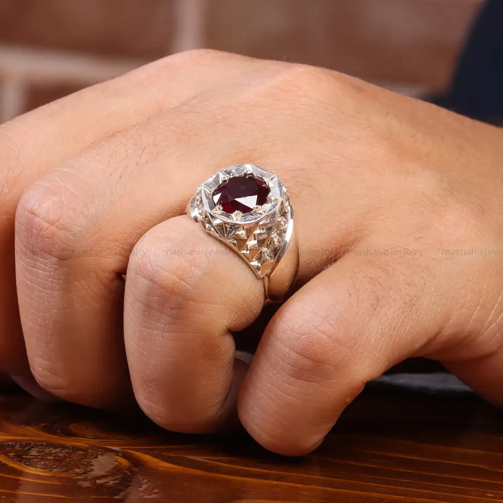 انگشتر یاقوت سرخ با رکاب دست ساز،فیلی و آینه کاری شده. به همراه مخراج کاری الماس با تراش برلیان. یاقوت سرخ آفریقا گوهری ارزشمند که بر روی رکاب این انگشتر کار شده است، زیبایی این اثر را چندین برابر میکند. جنس رکاب این انگشتر نقره با عیار 925 می باشد که به خاطر خواص و قیمت مناسب در جواهرسازی و ساخت انگشتر بسیار استفاده می شود.