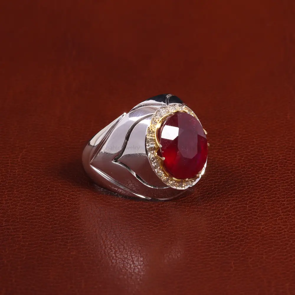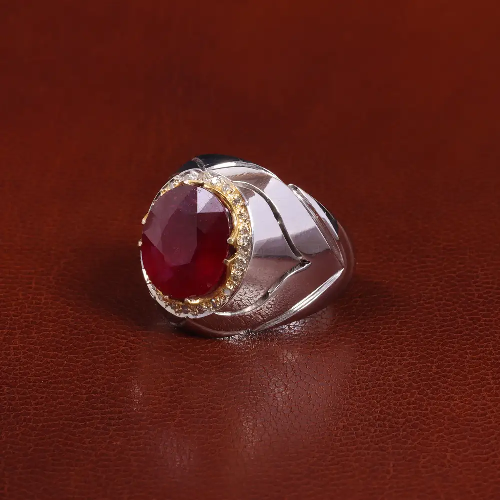انگشتر یاقوت سرخ با رکاب دست ساز . جنس رکاب این انگشتر نقره با عیار 925 می باشد که به خاطر خواص و قیمت مناسب در جواهرسازی و ساخت انگشتر بسیار استفاده می شود.