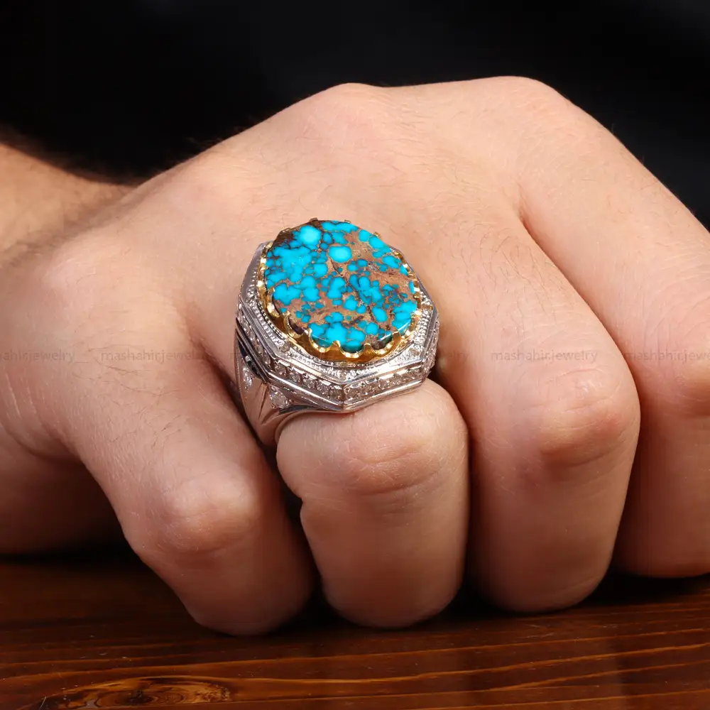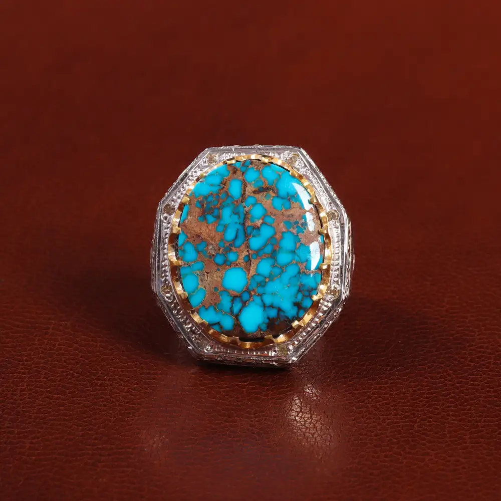 انگشتر فیروزه شجری گوهری ارزشمند که بر روی رکاب این انگشتر قرار گرفته و زیبایی این اثر را چندین برابر میکند. جنس رکاب این انگشتر نقره با عیار 925 ساخته شده است که به خاطر خواص و قیمت مناسب در جواهرسازی و ساخت انگشتر بسیار استفاده می شود.