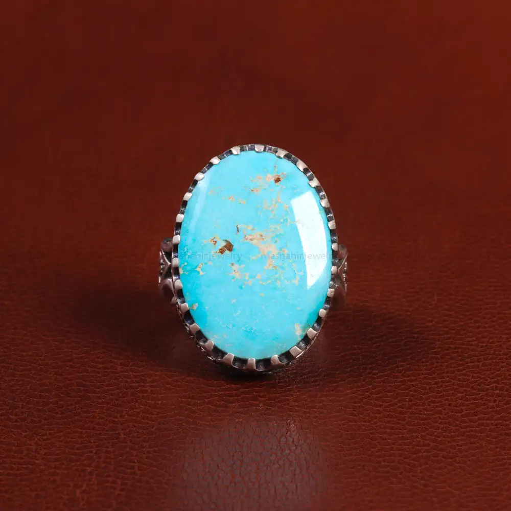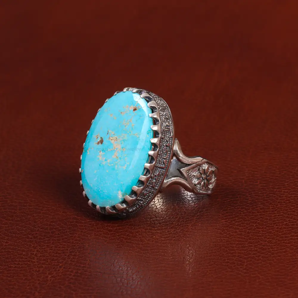 انگشتر فیروزه شجری ارزشمند که بر روی رکاب این انگشتر قرار گرفته و زیبایی این اثر را چندین برابر میکند. جنس رکاب این انگشتر نقره با عیار 925 ساخته شده است که به خاطر خواص و قیمت مناسب در جواهرسازی و ساخت انگشتر بسیار استفاده می شود.