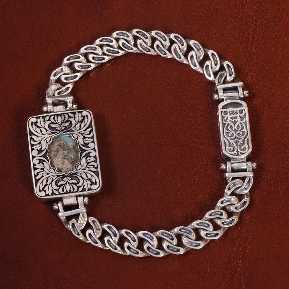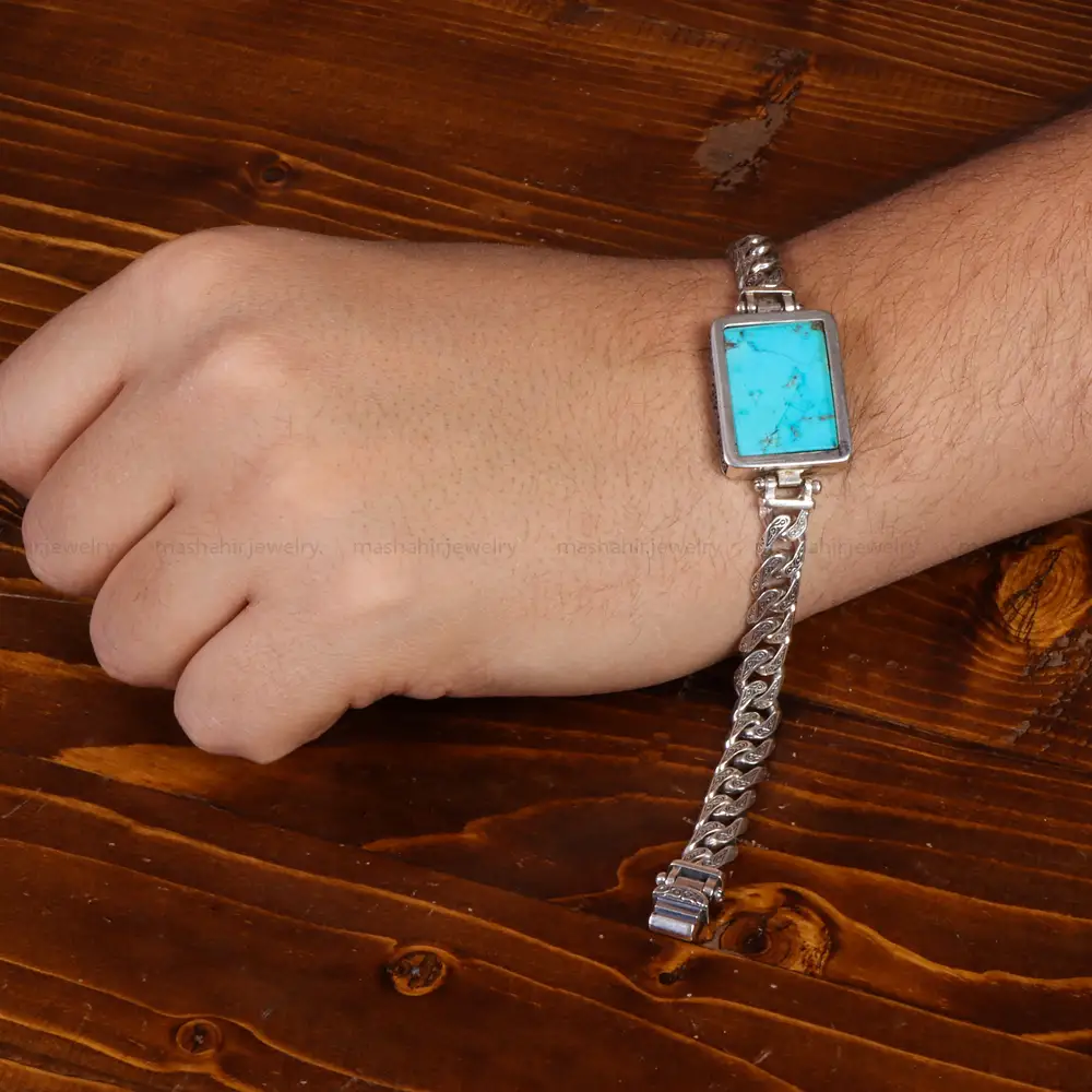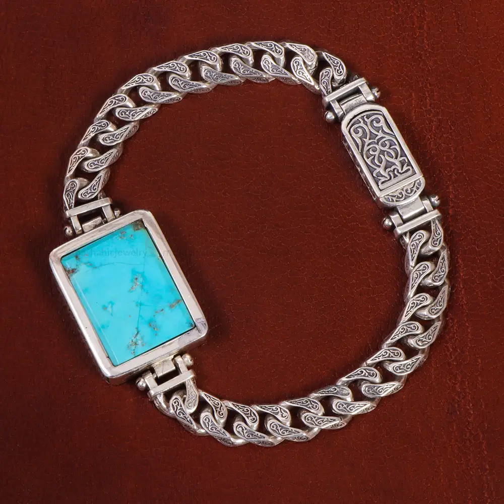 دستبند فیروزه شجری دست ساز.جواهر زیبای دیگری از مجموعه مشاهیر می باشد که با دقت و ظرافت ساخته شده است. فلز به کار برده شده در این دستبند نقره با عیار 925 می باشد که به خاطر خواص و قیمت مناسب در جواهرسازی بسیار استفاده می شود.