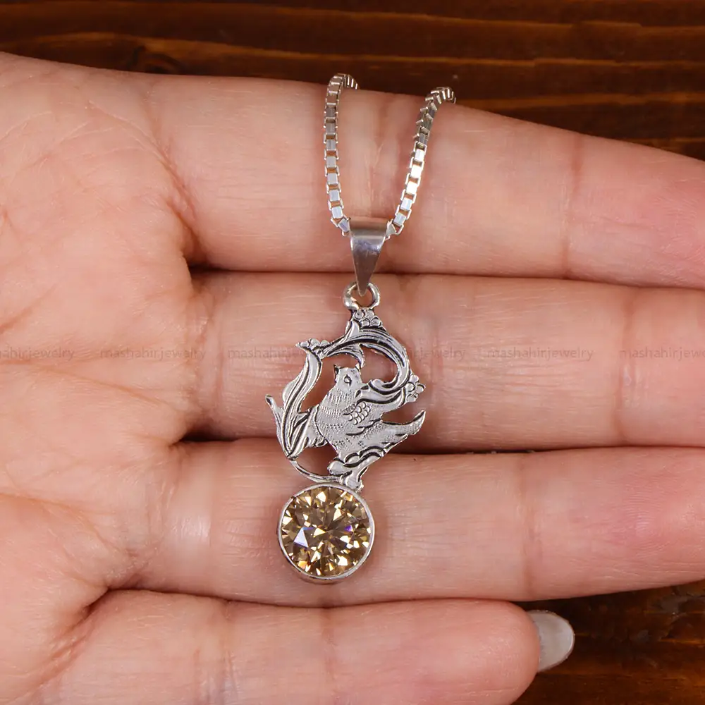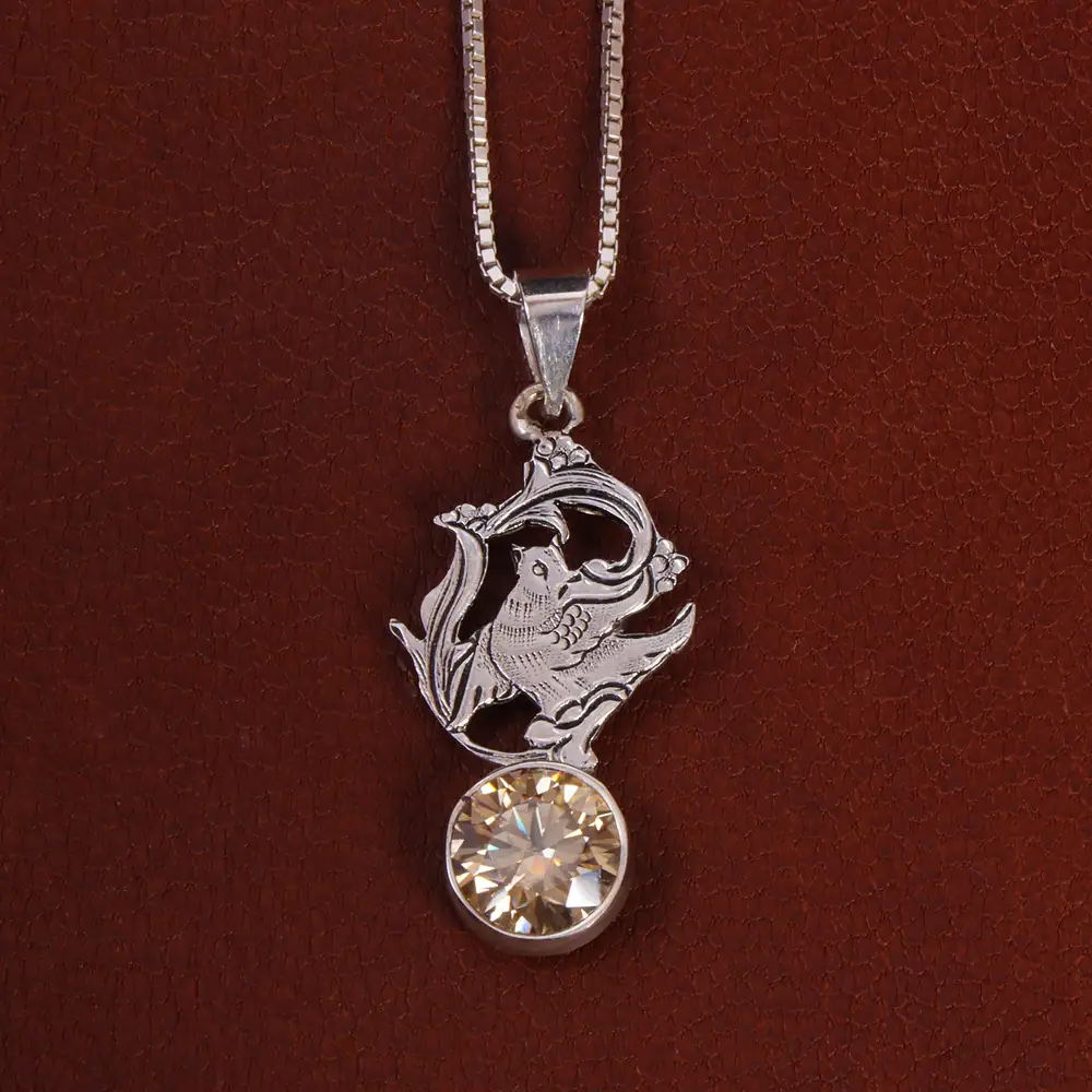 گردنبند موزانایت با دقتی بی نظیر و هنرمندانه ساخته شده است. موزانایت یا الماس روسی در رنگ های مختلف و جذاب زیبایی منحصربفردی به این جواهر زینتی داده است. امروزه مهمترین بخش استفاده از نقره مخصوصاً در ایران، به صورت جواهرات و زیورآلات می باشد. نقره یکی از فلزات غیر اکسید و تغییر رنگ دهنده که میتواند ماندگاری بالایی داشته باشد. در این جواهر بی نظیر از نقره خالص استفاده شده که زیبایی آن را دو چندان کرده است.