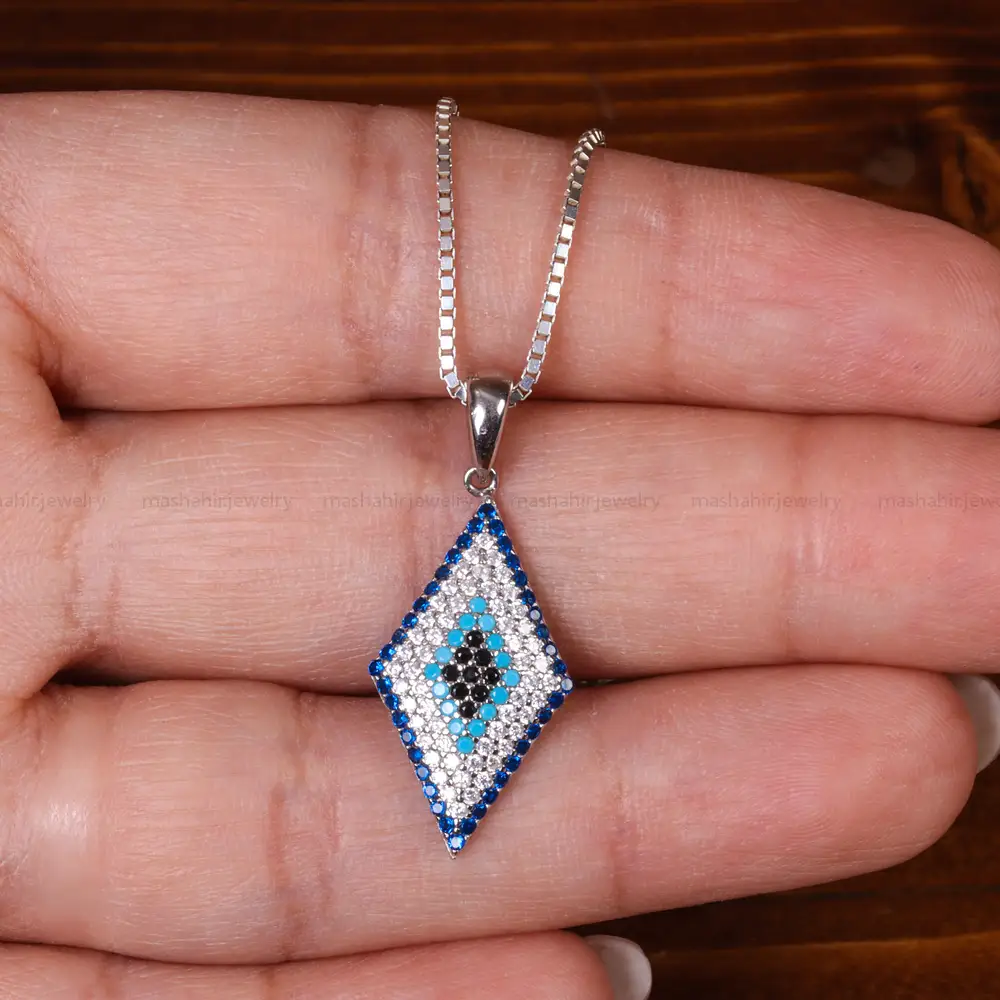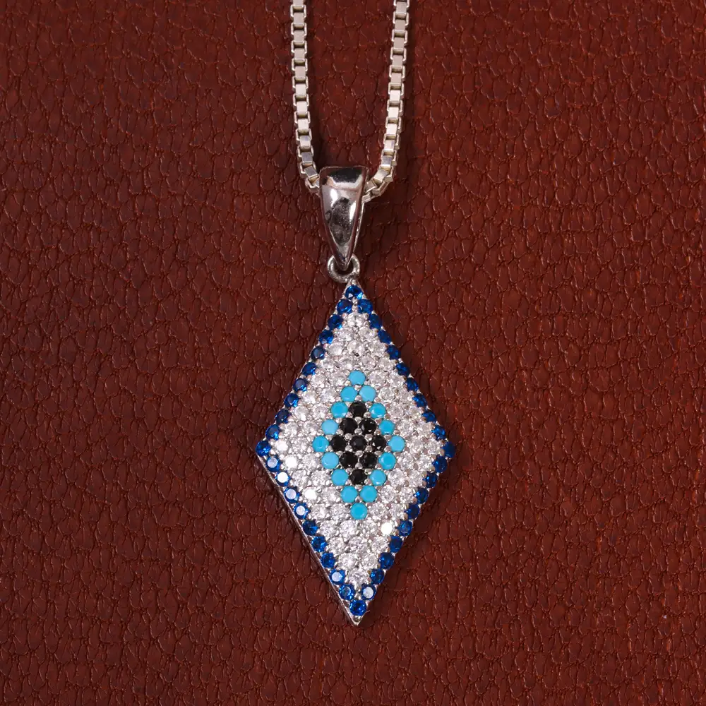 گردنبند نقره طرح چشم زخم با دقتی بی نظیر و هنرمندانه ساخته شده است. امروزه مهمترین بخش استفاده از نقره مخصوصاً در ایران، به صورت جواهرات و زیورآلات میباشد. نقره یکی از فلزات غیر اکسید و تغییر رنگ میباشد که میتواند ماندگاری بالایی داشته باشد. در این جواهر بی نظیر از نقره خالص استفاده شده که زیبایی آن را دو چندان کرده است.