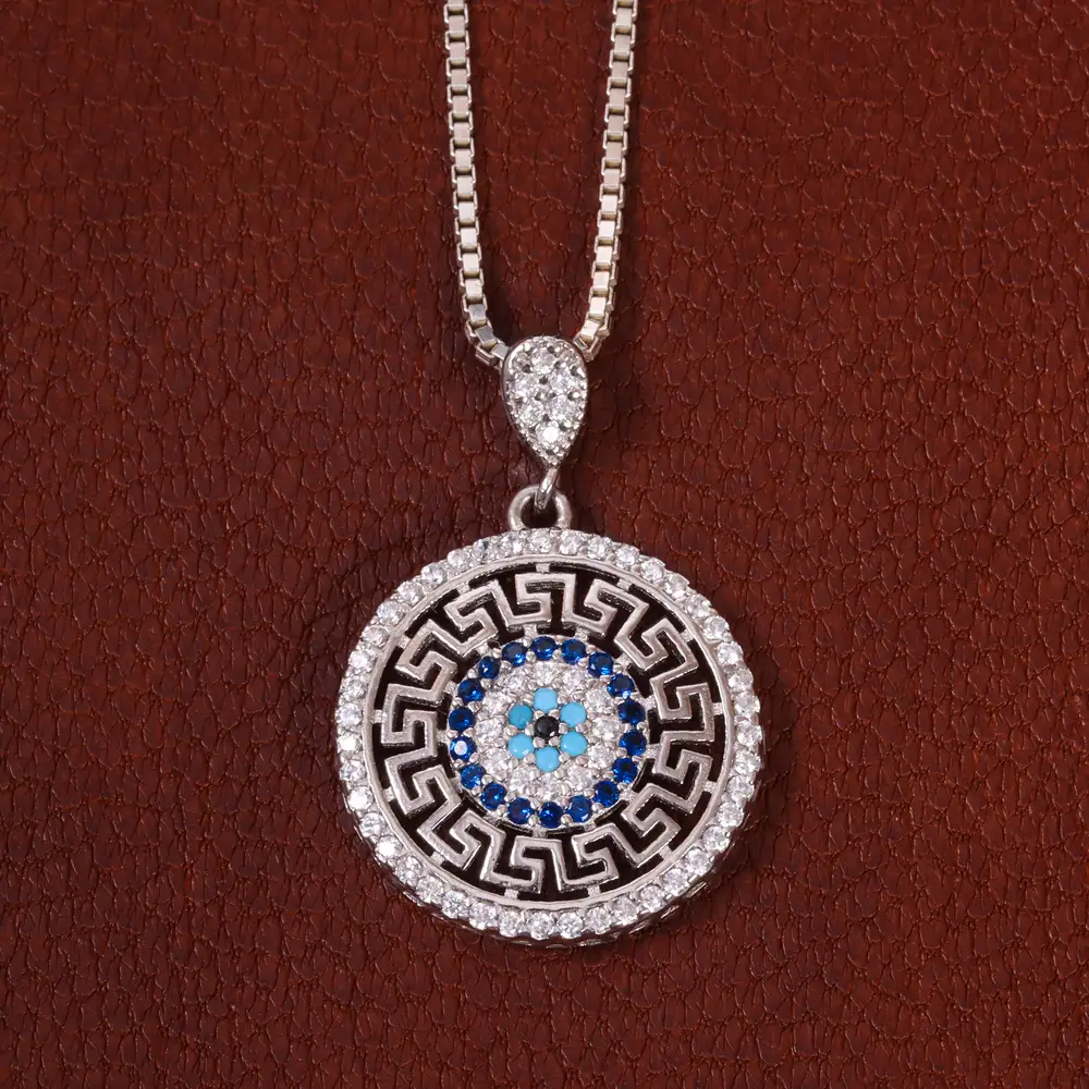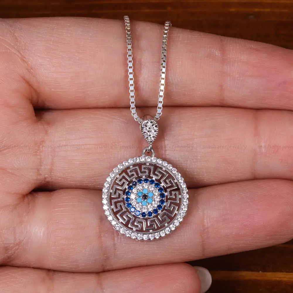 گردنبند نقره طرح چشم زخم با دقتی بی نظیر و هنرمندانه ساخته شده است. امروزه مهمترین بخش استفاده از نقره مخصوصاً در ایران، به صورت جواهرات و زیورآلات می‌باشد. نقره یکی از فلزات غیر اکسید و تغییر رنگ می‌باشد که می‌تواند ماندگاری بالایی داشته باشد. در این جواهر بی نظیر از نقره خالص استفاده شده که زیبایی آن را دو چندان کرده است.