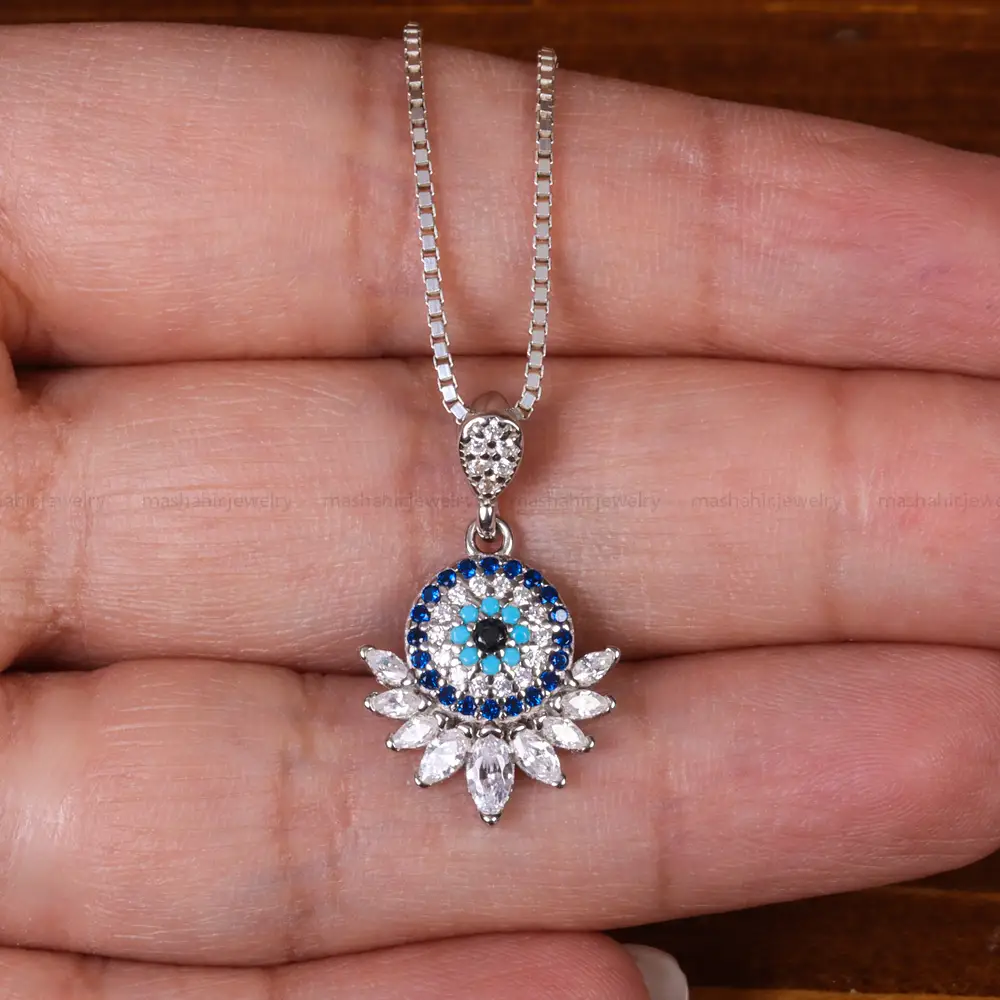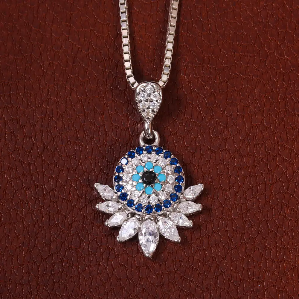 گردنبند نقره طرح چشم زخم با دقتی بی نظیر و هنرمندانه ساخته شده است. امروزه مهمترین بخش استفاده از نقره مخصوصاً در ایران، به صورت جواهرات و زیورآلات میباشد. نقره یکی از فلزات غیر اکسید و تغییر رنگ میباشد که میتواند ماندگاری بالایی داشته باشد. در این جواهر بی نظیر از نقره خالص استفاده شده که زیبایی آن را دو چندان کرده است.