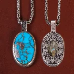 گردنبند فیروزه اسپرت کد 31379 به صورت دست ساز و از نقره 925 ساخته شده است. پشت قاب، طرح گل و مرغ با مهارت قلمزنی شده و جلوهای هنرمندانه و سنتی به اثر بخشیده است. این نقش نمادی از عشق و زندگی در هنر ایرانی است و در کنار سنگ اصیل نیشابوری، جلوهای از پیوند هنر و طبیعت را به نمایش میگذارد. پرداخت دقیق نقره و جایگیری منظم سنگ، کیفیتی ماندگار و ارزشمند به این اثر بخشیده است.