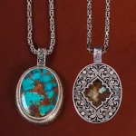 گردنبند فیروزه به صورت دست ساز و از نقره 925 ساخته شده است. قاب نقرهای با لبههای صیقلی، نگین فیروزه شجر نیشابوری را در بر گرفته است. پرداخت براق، جلوهای سنتی و اصیل به اثر بخشیده است. حلقه آویز با فرم مخروطی و پرداخت براق، هماهنگی کاملی با قاب دارد و استحکام لازم را برای نگهداری آویز فراهم کرده است. انتخابی ارزشمند برای آقایان و بانوانی است که اصالت و معنا را در کنار زیبایی طبیعی میپسندند.