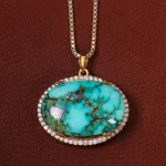 گردنبند فیروزه زنانه، این محصول با دقتی بی نظیر و هنرمندانه ساخته شده است. در این جواهر بی نظیر از سنگ فیروزه شجری اصل نیشابور استفاده شده که زیبایی آن را دو چندان کرده است. جنس فلز این گردنبند نقره با عیار 925 می باشد که به خاطر خواص و قیمت مناسب در جواهرسازی بسیار استفاده می شود.