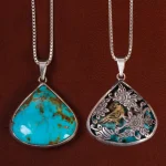 گردنبند فیروزه با فریم طرح درختی بافته شده از فلز نقره. روی این گردنبند زیبا نگین فیروزه شجری اصل نیشابوری قرار گرفته است و فریم متفاوت آن از فلز نقره 925 بافته شده با دست طرح درختی میباشد که باعث خلق اثری جدید و بسیار خاص شده است.