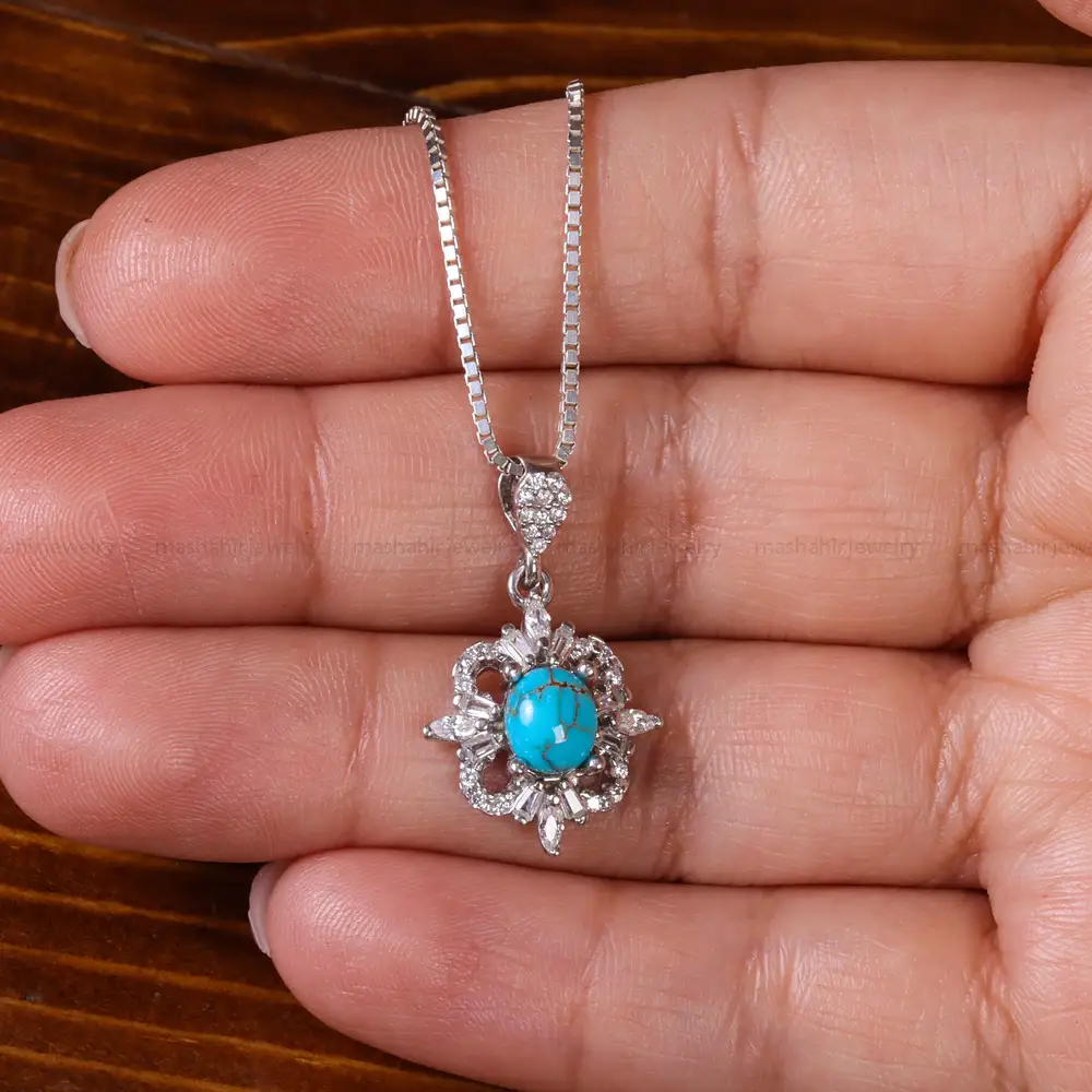 گردنبند فیروزه زنانه، این محصول با دقتی بی نظیر و هنرمندانه ساخته شده است. در این جواهر بی نظیر از سنگ فیروزه شجری اصل نیشابور استفاده شده که زیبایی آن را دو چندان کرده است. جنس فلز این گردنبند نقره با عیار 925 روکش رادیوم می باشد که به خاطر خواص و قیمت مناسب در جواهرسازی بسیار استفاده می شود.