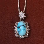گردنبند فیروزه زنانه، این محصول با دقتی بی نظیر و هنرمندانه ساخته شده است. در این جواهر بی نظیر از سنگ فیروزه شجری اصل نیشابور استفاده شده که زیبایی آن را دو چندان کرده است. جنس فلز این گردنبند نقره با عیار 925 روکش رادیوم می باشد که به خاطر خواص و قیمت مناسب در جواهرسازی بسیار استفاده می شود.